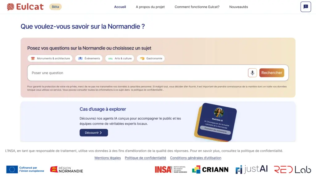 EULCAT est un agent conversationnel spécialisé dans la valorisation du patrimoine normand, basé sur des données locales fiables et une infrastructure souveraine, visant à proposer une alternative plus précise et contextualisée aux assistants généralistes.